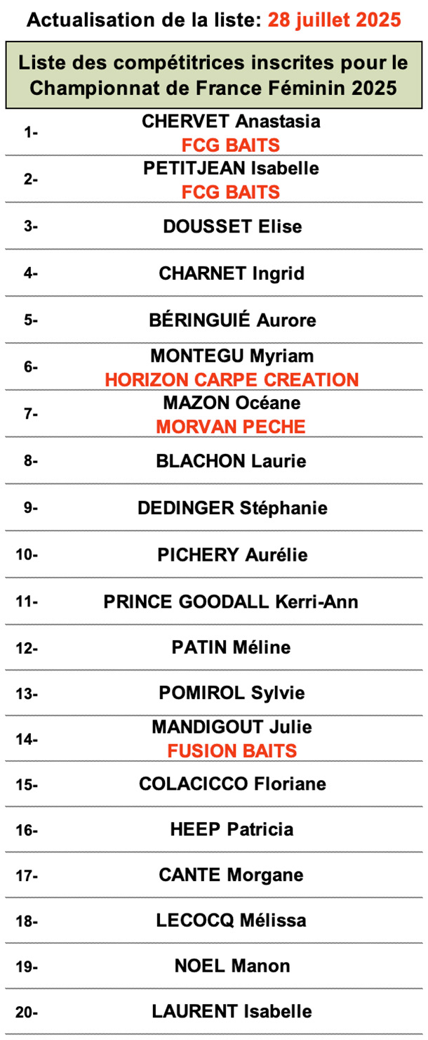 Cette compétition se pratique en individuel. Une seule compétitrice par poste de pêche (Contrairement aux championnats séniors ce championnat ne nécessite pas d’être en binôme). Il est ainsi, plus facile de participer, d’autant plus qu’il se déroule sur une période de temps plus courte (48 heures).